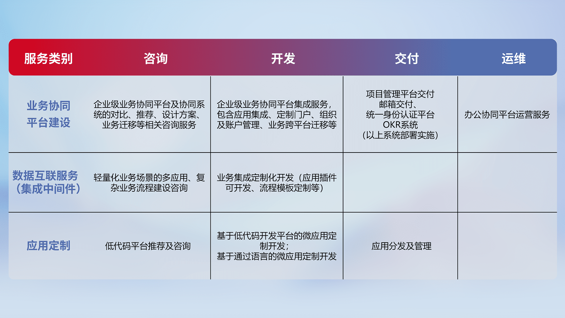 针对钉钉、、、企微、、、IDaas等平台级产品提供产品的规划、、、方案、、交付、、、定制化开发等服务,,实现如统一协同办公、、、智能客户服务、、混合会议管理、、、、智能数据查询、、等业务场景,,,实现数字化转型。。。